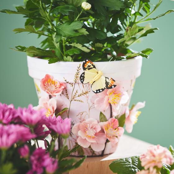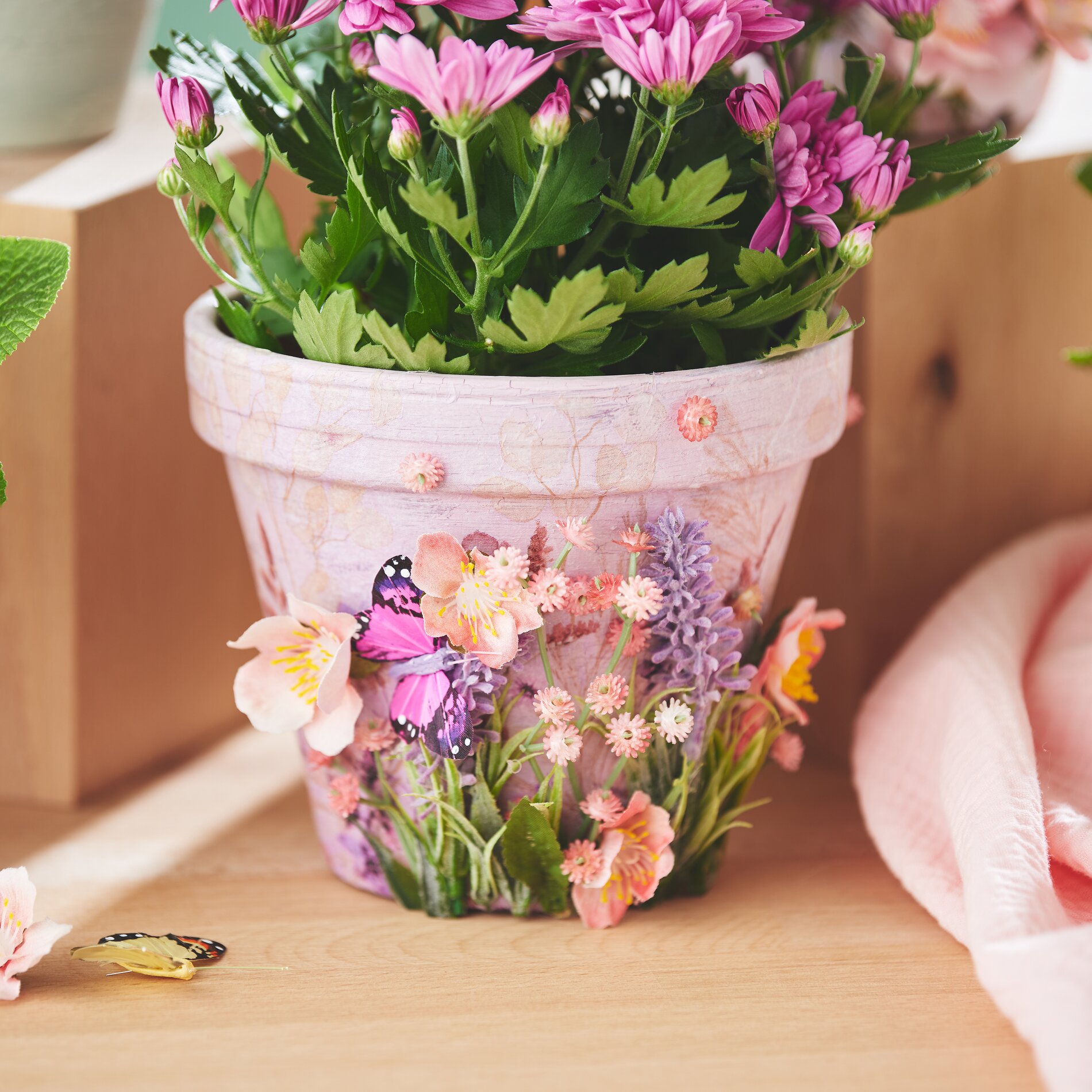 Další tipy pro návrháře- Zkraťte umělé květiny nebo vezměte jednotlivé květiny a přilepte je na květináč horkým lepidlem.