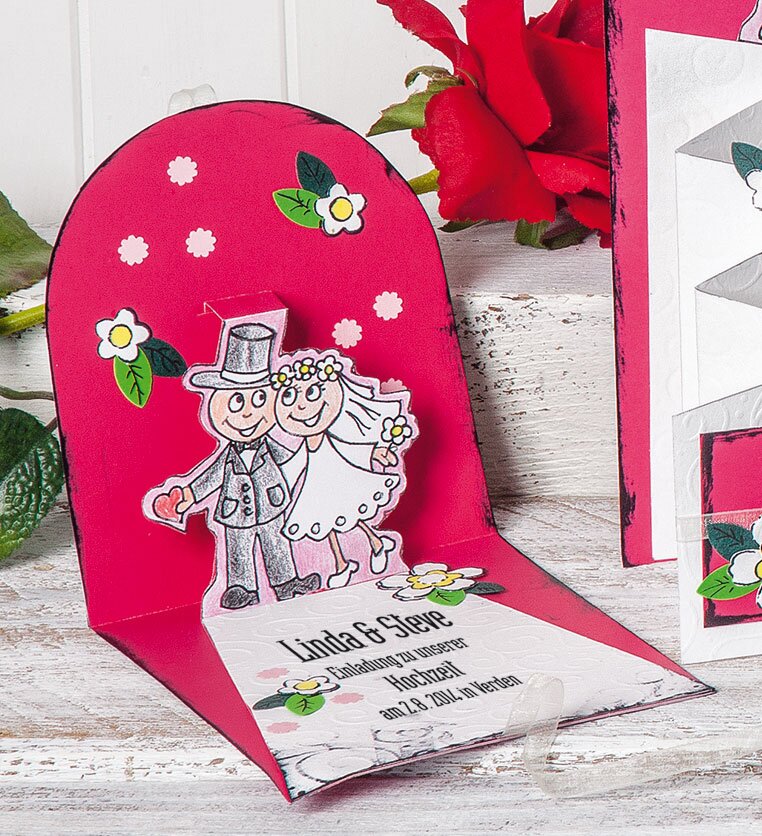 Vytvořte si šablonu ze šablony a vystřihněte růžově zbarvený barevný papír. Z reliéfního kartonu vystřihněte části cesty a chlopně přání. Cesta slouží jako textové pole na přání. Vytiskněte a vybarvěte ženicha a nevěstu, nalepte je na barevný papír a vystřihněte. Nyní přilepte textové pole z reliéfního kartonu na spodní část nevěsty a ženicha a to zase na spodní okraj karty s kouskem šifonové stuhy mezi nimi, která bude součástí uzávěru. Skalpelem prořízněte štěrbinu na značce a provlékněte jí klopu svatebního páru. Na okrajích ji zajistěte páskou. Nyní přilepte reliéfní obal karty na horní stranu a přidejte sem 2. šifonovou stuhu. Z barevného papíru vyražte pomocí děrovačky motivy květin a ozdobte jimi přání. Obtáhněte je ostrou fixou a vybarvěte žilky listů. Aby přání získalo hloubku, přetřete okraje inkoustovým polštářkem. Budete také potřebovat barevné tužky.