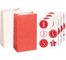 Snadné adventní kalendáře! S touto sadou si snadno a rychle vytvoříte nádherný adventní kalendář. Sáčky v červené barvě s bílými puntíky a bílé barvě s červenými puntíky nabízejí dostatek prostoru pro drobné dárky a sladkosti. Kalendář v moderním stylu, jehož tvoření je rychlé a snadné. Pokud chcete, můžete jej doplnit malými papírovými visačkami, zvonečky, dekoračními prvky a stužkou. Tím dodáte této sadě osobní vzhled.