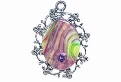 Vyválejte co nejplošší výplň a vložte ji do přívěsku Tip: Nejlépe to provedete tak, že přední část přívěsku vtlačíte do FIMO a přebytečnou část odříznete řezákem. Křišťálové korálky Swarovski lehce vtlačte do směsi FIMO, hotový přívěsek položte na pečicí papír a nechte ztuhnout v troubě při teplotě 110 °C přibližně 30 minut a nechte vychladnout.