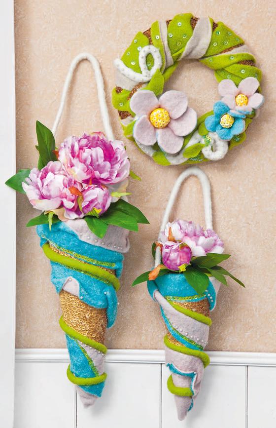 Okraje ozdobte duhovými zelenými flitry. Ustřihněte kousek bílé plstěné šňůrky na zavěšení a připněte ji na protější kužel. Zkraťte stonky květin a ozdobte je.