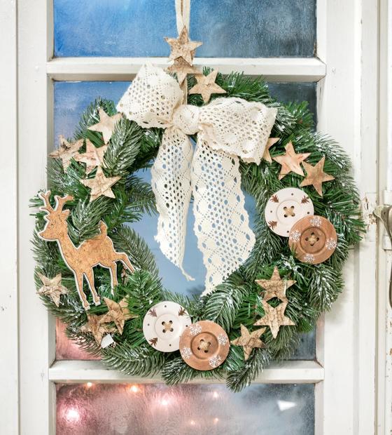 Pomocí horkého lepidla přilepte na věnec korkové hvězdy a jelena nebo jiné ozdobné doplňky podle vlastního vkusu.