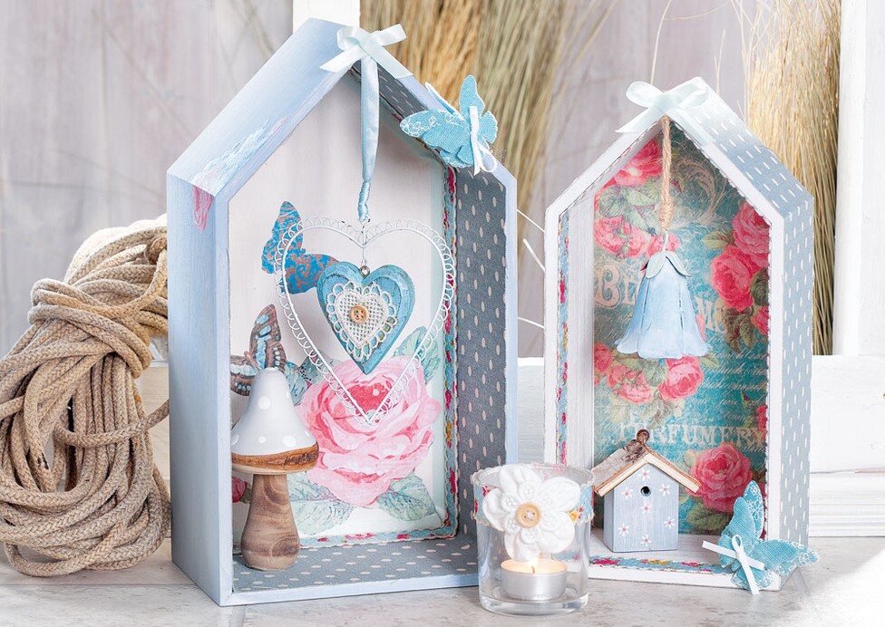 Zadní stěnu a střechu domečku polepte motivem ze slaměného hedvábí pomocí ubrouskového laku. Květinovou stuhu připevněte na vnitřní stranu pomocí pásky. Stejným způsobem ozdobte krajkovou stuhou přední vnější okraj krabice s poličkou. Nakonec k domečku připevněte pomocí horkého lepidla požadovaný přívěsek nebo ozdobnou figurku.