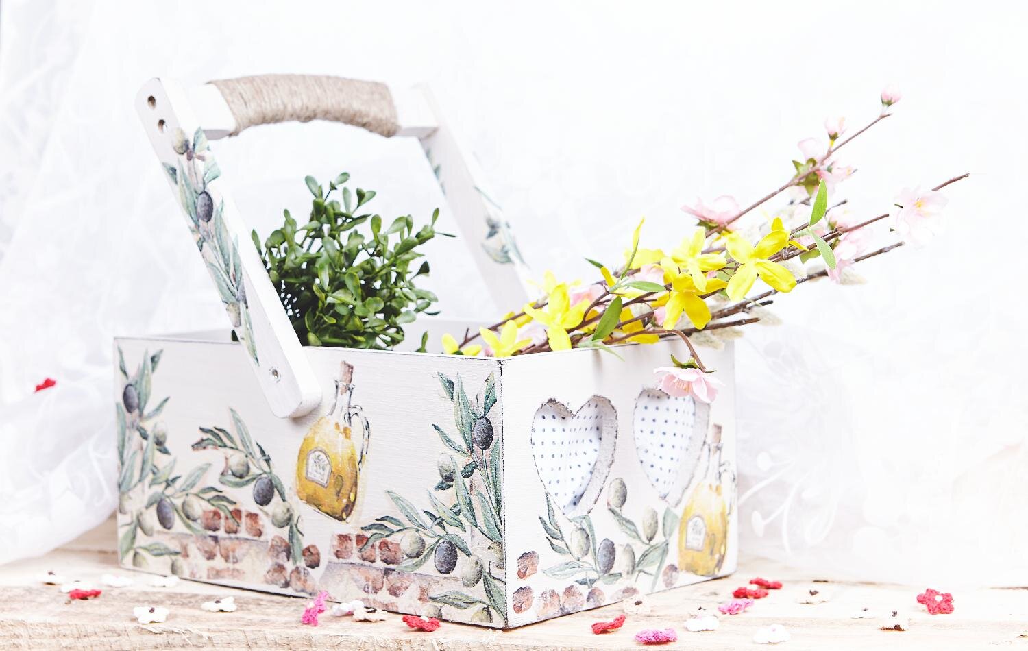 Jednotlivé motivy se vystřihnou z ubrousku . Jakmile barva zaschne, lze prvky motivu předem naaranžovat na dřevěnou krabičku a v případě potřeby je trochu přesněji vystřihnout. Nyní opatrně odstraňte vrchní vrstvu z dílků ubrousku, vybranou plochu z dřevěného košíku natřete lepidlem na ubrousky, umístěte motivy a opatrně je uhlaďte štětcem.