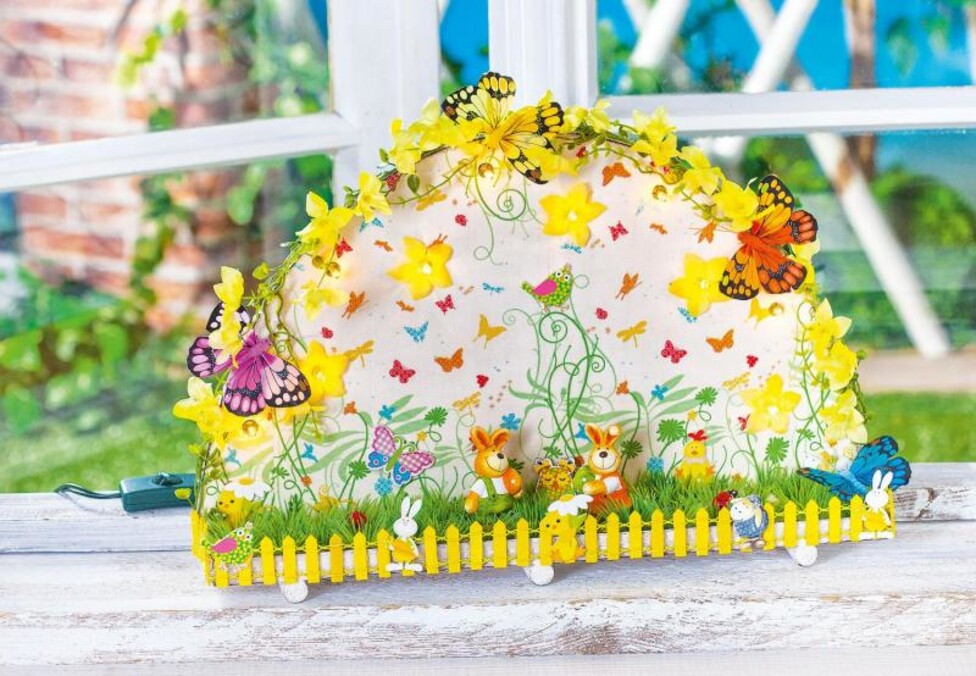 Nyní ubrousek zapečetěte lakem na ubrousky VBS tak, že jej nanesete štětcem na motiv zevnitř směrem ven. Použijte k tomu štětec na ubrousky VBS, který umožňuje rovnoměrné nanášení a minimalizuje riziko pomačkání nebo natržení motivu. Po zaschnutí odřízněte přebytečný papír skalpelem. Vystřihněte travní rohož tak, aby se vešla na základní desku, a připevněte ji, stejně jako plot, horkým lepidlem. Nyní můžete světelný oblouk ozdobit rozsypanými dílky, motýly, dvojicí králíků a narcisovým věncem a zezadu vložit do předvrtaných otvorů pohádková světýlka. V případě potřeby je můžete na místě zafixovat horkým lepidlem. Nakonec přes světýlka přetáhněte několik květů narcisů z girlandy.