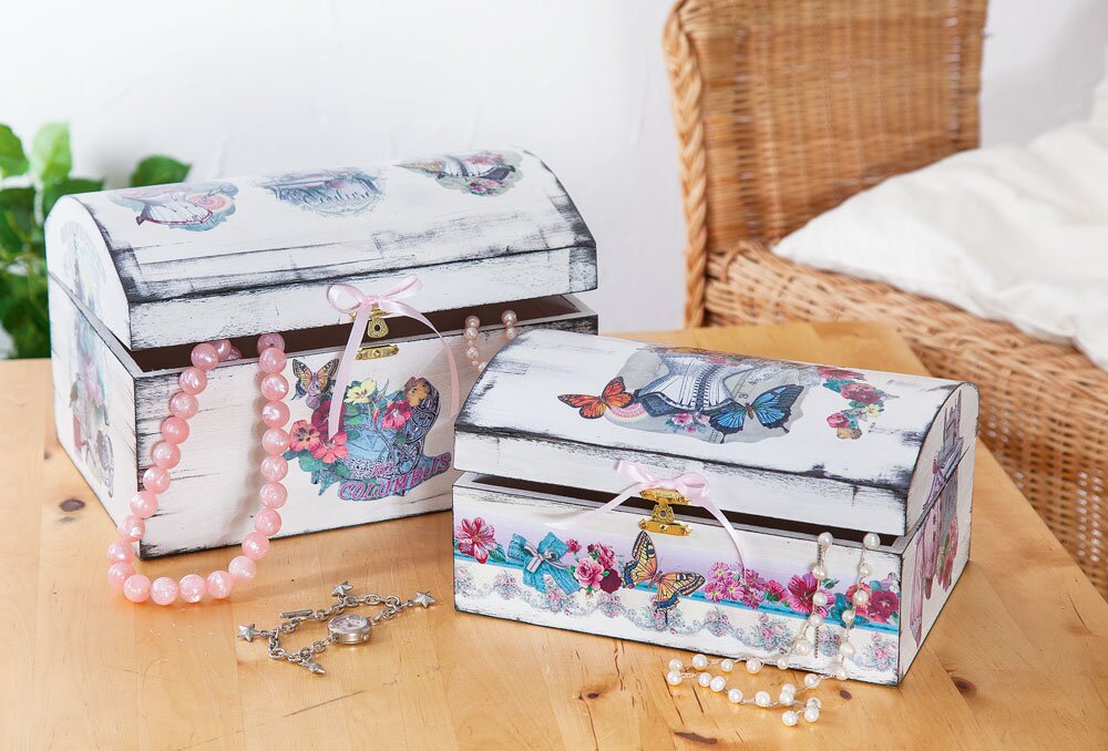 Krásné slaměné hedvábí s motivy z krejčovské dílny promění tyto dřevěné truhly v malé organizéry. Do pěkných truhliček můžete ukládat šicí potřeby, jako jsou knoflíky, jehly a nitě, nebo dokonce šperky, abyste vše vždy znovu našli.