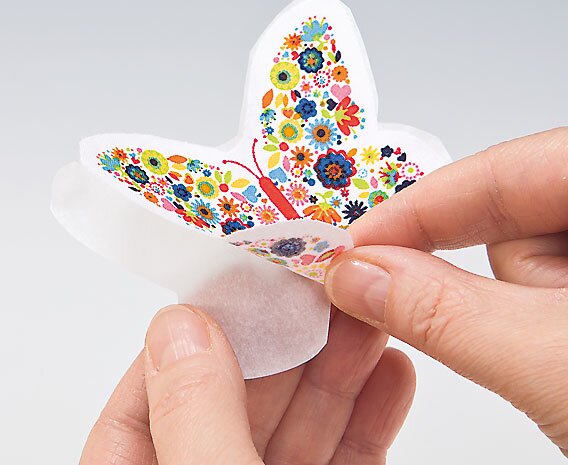 Nahrubo vystřihněte jednoho motýla , nažehlete ho na drsnou stranu nažehlovacího stabilizátoru při teplotě bavlny a znovu přesně vystřihněte. Odstraňte ochranný papír ze zažehlovacího stabilizátoru a nažehlete motýla na pravou stranu velkého polotovaru.