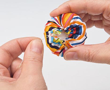 Pro bobulku zajíčka vystřihněte z druhé látky kruh o průměru 10 cm nebo 8 cm a ručně jej obšijte podšívkovou nití po celém obvodu. Navrch položíme vatu a kousek kartonu nebo pevné fólie o průměru 3,5 cm a vystřižený díl opatrně utáhneme zapošívací nití. Hotovou bambuli přišijte k zajíčkovi.