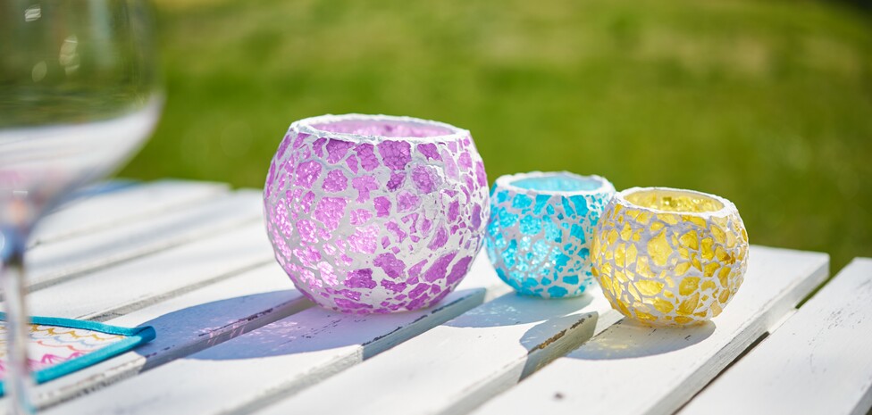 Nyní naneste na povrch skleničky na čajovou svíčku trochu mozaikového lepidla, počkejte přibližně 10 minut, aby lepidlo odleptalo a dosáhlo dokonalé přilnavosti. Pinzetou nabírejte jednotlivé dílky mozaiky a postupně je po malých plochách (tak, aby nic nesklouzlo) pokládejte na sklenici na čajové svíčky, dokud není celá plocha zaplněna dílky.