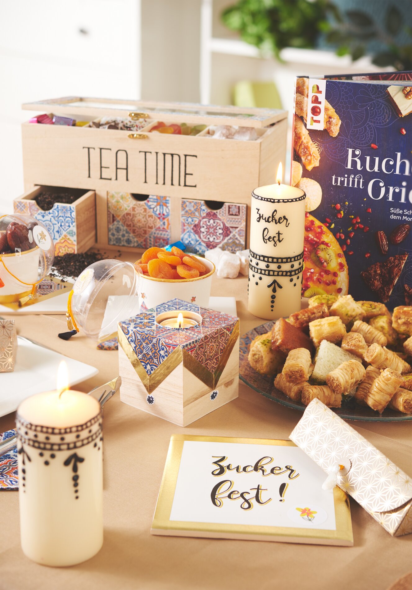 Čajové kostky ze dřeva by měly být nejprve natřeny základní barvou starožitnou bílou řemeslnou barvou. V našem dekorativním příkladu byl ubrousek nanesen přes rohy a okraje pak byly ozdobeny proužkem zlaté ozdobné pásky.