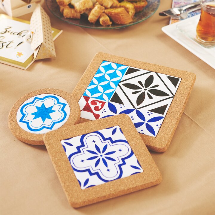 Podložky pod dlaždice a krabičku na čaj lze také ozdobit tímto způsobem.