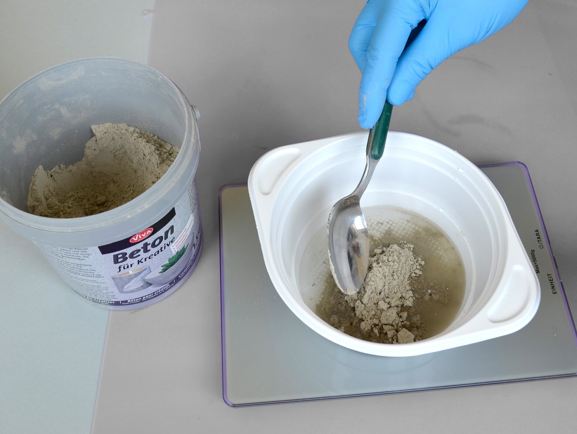 Krásné betonové misky vyrobíte tak, že nejprve rozříznete vršek staré PET lahve a přes otvor přetáhnete balónek. Smíchejte beton s vodou podle návodu na obalu výrobku. Nyní nalijte vzniklou betonovou směs do balónku, nafoukněte jej pomocí vzduchové pumpy a konec balónku zavažte na uzel.