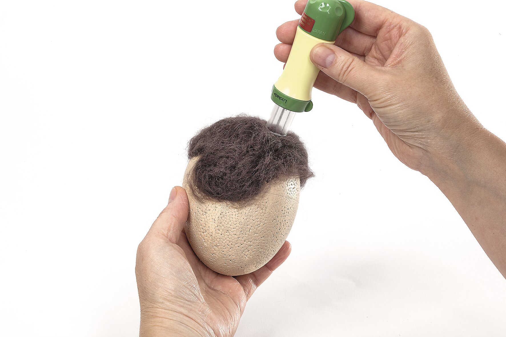 K plstění budete potřebovat vlněná vlákna a plstící nástroj. Z vlněného rouna natrhejte trochu žluté pohádkové vlny, rozprostřete ji na první plochu polystyrenové zmrzliny a zapíchněte plstící jehlu nebo při použití turbo plstícího stroje několik plstících jehel do pokryté plochy polystyrenové zmrzliny. Háčky plstící jehly spojí vlněná vlákna s polystyrenem. Tento postup opakujte, dokud není celé vejce pokryto žlutou vlnou.