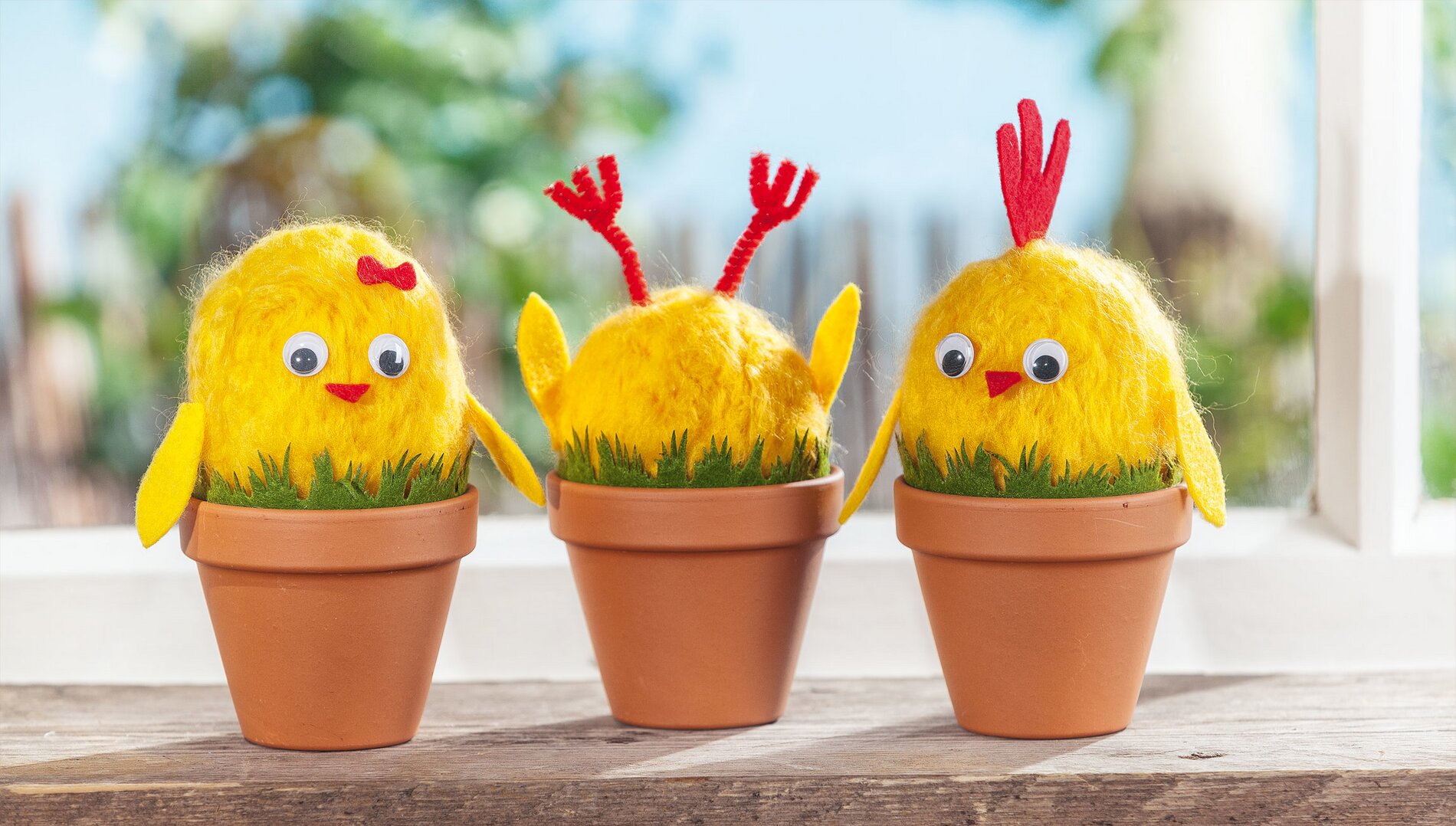 Kuřátka umístěte do malých terakotových květináčů (v případě potřeby je také připevněte horkým lepidlem) a okraj ozdobte "trávníkovou" plstěnou stužkou.