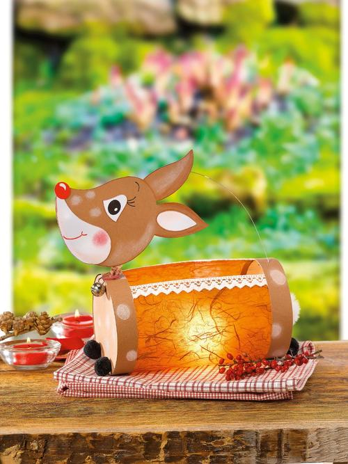 Es muss ja nicht immer buntes Transparentpapier sein. Strohseide eignet sich hervorragend zum Bekleben von Untergründen. Dieser besteht beim Bau von Laternen häufig aus blanko Transparentpapier. Mit Serviettentechnik einfach die Strohseide auf das Transparentpapier kleben und fertig ist das bunte Licht. Bei der Beispiellaterne auf dem Foto wurde mal um die Ecke gedacht und die Laterne quer gelegt. Die niedliche Rehlaterne kann mit dem Buch „Kinderleichte Laternen“ gebastelt werden.