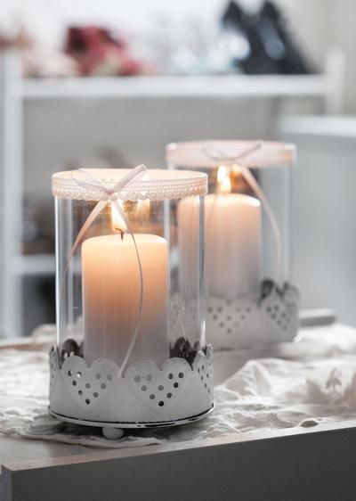 Die Farbpalette reicht von allen Weißschattierungen über Creme bis hin zu helleren Braun- und Grautönen. Wenn ihr Möbel und Dekorationen ein neues Farbkleid geben möchtet, könnt ihr beispielsweise unsere Bastelfarbe „Hobby Color“ benutzen. Dabei handelt es sich um eine Acrylfarbe für alle möglichen kreativen Arbeiten auf Holz, Metall, Kunststoff oder Terrakotta. Hier mal ein Beispiel mit Windlichtern aus Zink.