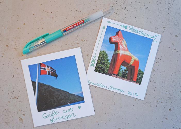 Wer seine Postkarte im Polaroidlook nun nicht weiter verzieren mag, muss sie nur noch beschriften und mit der Post verschicken. Wer mag, kann natürlich mit Hilfe Farben und Stickern noch tolle Effekte erzielen. Ich habe mich für einen Metallliner von Edding entschieden, mit dem ich die Karten noch etwas aufgewertet habe.
