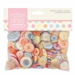 Nun werden nach Belieben Knöpfe von groß nach klein aufeinander gestapelt und mit der Heißklebepistole fixiert. Holzknöpfe können auch mit Stempelfarbe ein antikes Finish erhalten. Satin- und Bastbänder zu dekorativen Schleifen binden und mit kleinen Knöpfen verzieren.Für unsere Karten haben wir folgende Knöpfe, Bänder und Deko verwendet: