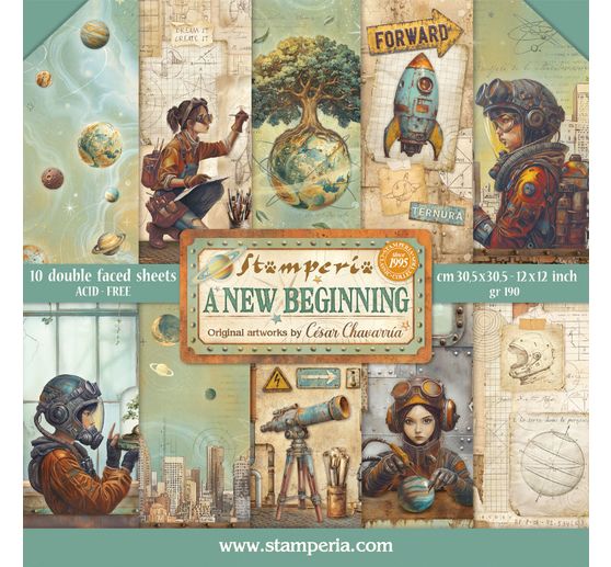 Zažijte kreativní cestu ke hvězdám s Blok pro scrapbook "A New Beginning"! Navrhněte jedinečné projekty inspirované astronauty, roboty, raketami, nápisy, siluetami mrakodrapů, stromem na zeměkouli a dalšími motivy.