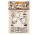 S průhlednými razítky "Káva a čokoláda" od společnosti Stamperia můžete tvořit podle vlastních představ a přání. Těchto 7 razítek je vyrobeno z vysoce kvalitního silikonu a obsahuje motivy, jako je vzor kávových zrn, list s nápisem, kávová zrna, zbytky z kávového šálku a šálek naplněný kávou. Razítka jsou skutečným zpestřením vaší řemeslné práce.