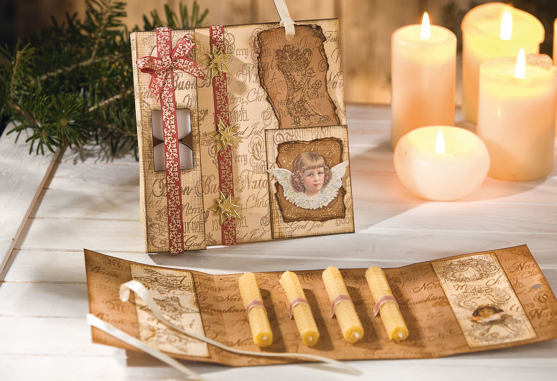 Do karty zasuňte čtyři čajové svíčky a zajistěte je stuhou. Vedle ní přilepte na přání další stuhu.