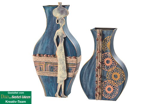 Dekorativní vázy z papírmašé získávají typický africký vzhled s velkými MDF dekoracemi a vyraženými etnickými motivy. Doplňují je přírodní materiály, jako jsou jutové provázky a dřevěné korálky.