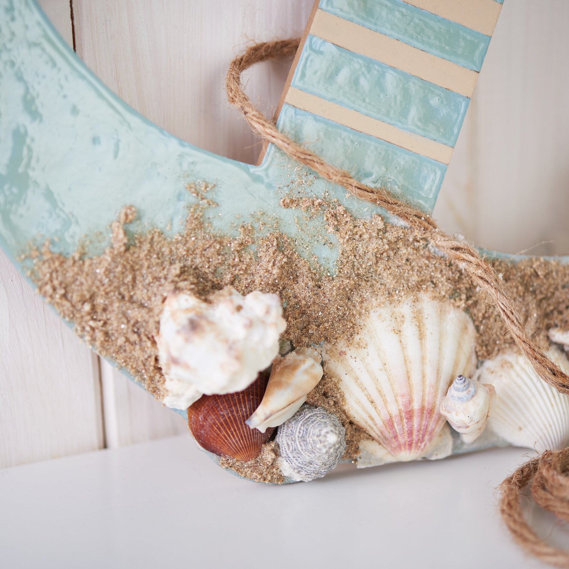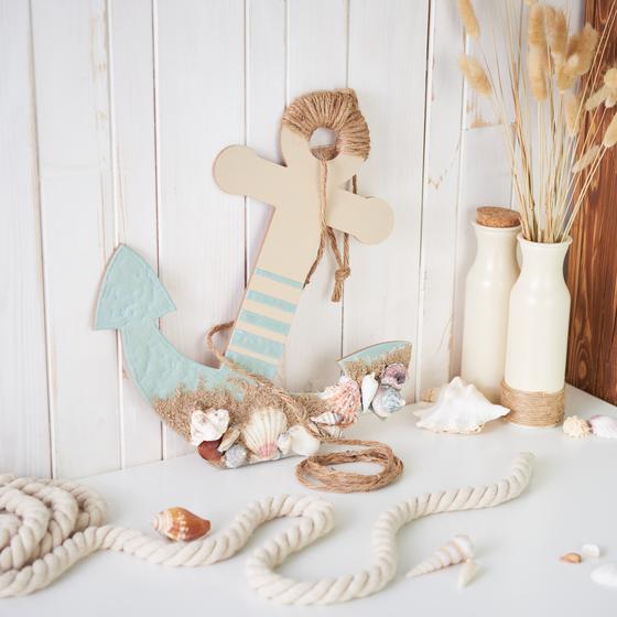 Základem tohoto nápadu na výzdobu je řemeslný polotovar VBS dřevěná kotva. Začněte tím, že celý kus dřeva natřete béžovou barvou. Poté spodní část dřevěné kotvy obarvěte barevnými pruhy v mořské zelené nebo podobné barvě: Pomocí pravítka a tužky si na polotovar nakreslete jemné čáry, které přesně vymezí jednotlivé barevné plochy a usnadní vám natírání mořskou barvou. Dbejte na to, aby byly barevné okraje co nejpřesnější.