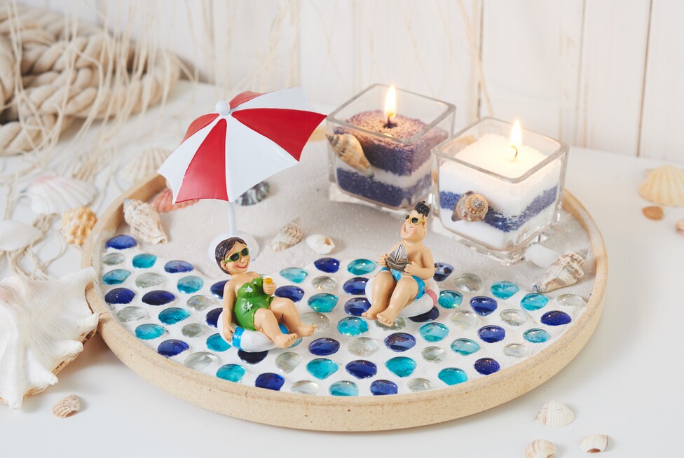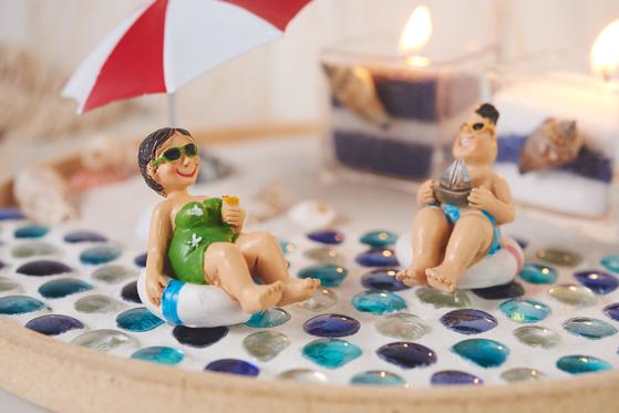 Nyní si užijte zdobení misky Sea Vacations malými prázdninovými figurkami, letním deštníkem a krásnými mušlemi.