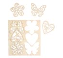 Ideální na velikonoční větvičky, jarní dekorace nebo jako ozdoby do oken. Květiny, srdíčka a motýli mají otvor na zavěšení. Materiál je ideální k vybarvování. S trochou barev a drobných korálků a stužek si můžete vyrobit přívěsky na velikonoční keř, okenní dekorace nebo drobné dárky pro své přátele. Tyto motivy vypadají skvěle také jako visačky na velikonoční dárky.