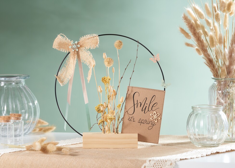 Nejprve vezměte jutovou a taftovou stuhu a přivažte je ke kovovému kroužku. Zde můžete stuhy uvázat a naaranžovat jednotlivě. Ozdobný kroužek pak můžete vložit do dřevěného stojanu. Jakmile je ozdobný kroužek pevně na svém místě, můžete požadované sušené květiny nastříhat na požadovanou délku a vložit je do připravených otvorů.