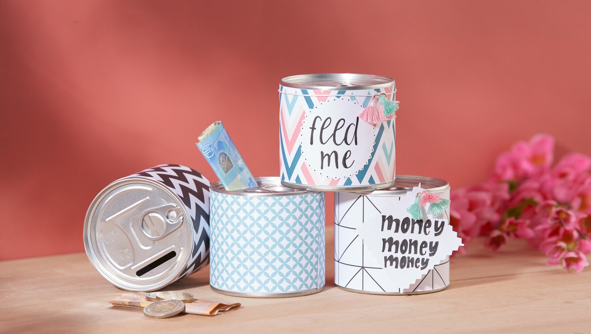 Přilepte proužek oboustranné lepicí pásky na horní a spodní okraj pokladničky a odstraňte ochrannou fólii. Papírový proužek nalepte kolem plechovky s kroužkovým tahem.