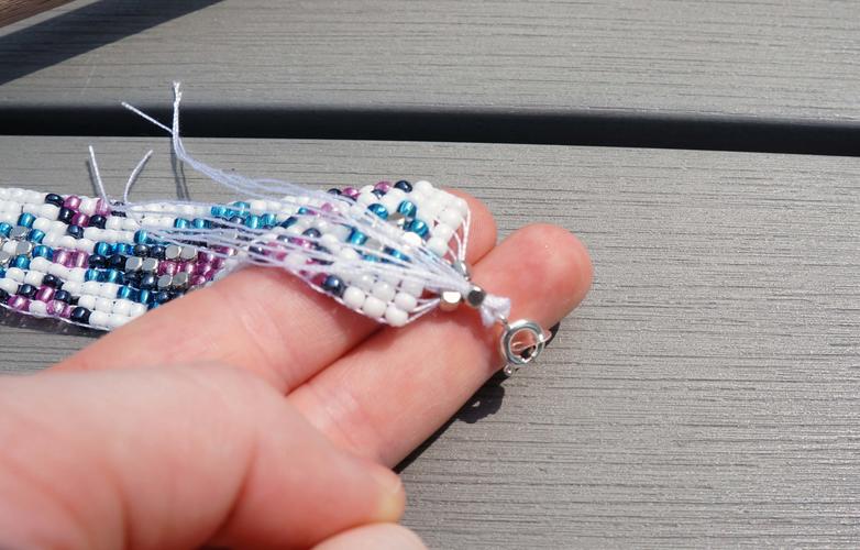 Jste s náramkem a jeho délkou spokojeni? Pak jej můžete z rámečku odstřihnout. Stužky v nejvzdálenějším bodě odstřihněte a zapleťte je nebo ozdobte korálky pro krásný závěr. Zauzlujte sponu na šňůrce: rozdělte konce a po navlečení spony uvažte dvojitý uzel. K tomuto kroku použijte jehlu na korálky. Pokud jste si vybrali verzi se třemi korálky na konci, můžete nitě protáhnout korálkem, abyste uzel skryli. Odstřihněte přebytečné nitě a užívejte si svůj osobní náramek!