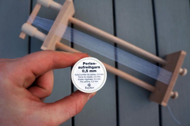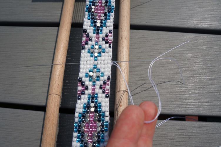 První řada vyžaduje trpělivost. Vhodnou jehlou navlékněte na přízi potřebný počet korálků. Korálky umístěte do mezer mezi napnuté šňůrky. Ukazováčkem vtlačte korálky do prostorů mezi řadami zespodu. Provlékněte jehlu všemi korálky - podél spodní části přední řady a podél horní části zadní řady. Korálky tak zůstanou na tkalcovském stavu. Nechte si dostatečný prostor pro konec stuhy, široký asi dva prsty, a nezačínejte tkát hned u dřeva.