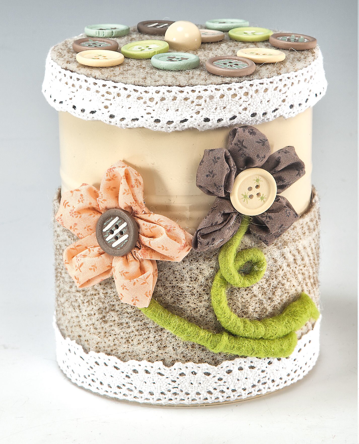Krajkovou stuhu přilepte kolem víčka mašličkami směrem dolů a kolem základny mašličkami směrem nahoru. Každou z částí látky rozstříhejte na čtyři stejné díly a sestavte pět kusů na květinu. Ve čtyřech rozích shromážděte kousky k sobě a omotejte je drátem, přičemž jednotlivé okvětní lístky přivažte přímo k sobě. Konce drátku pevně stočte k sobě a doprostřed přilepte knoflík. Květy přilepte na plechovky a mezi ně přilepte plstěnou šňůru v kudrlinkách jako stonky.