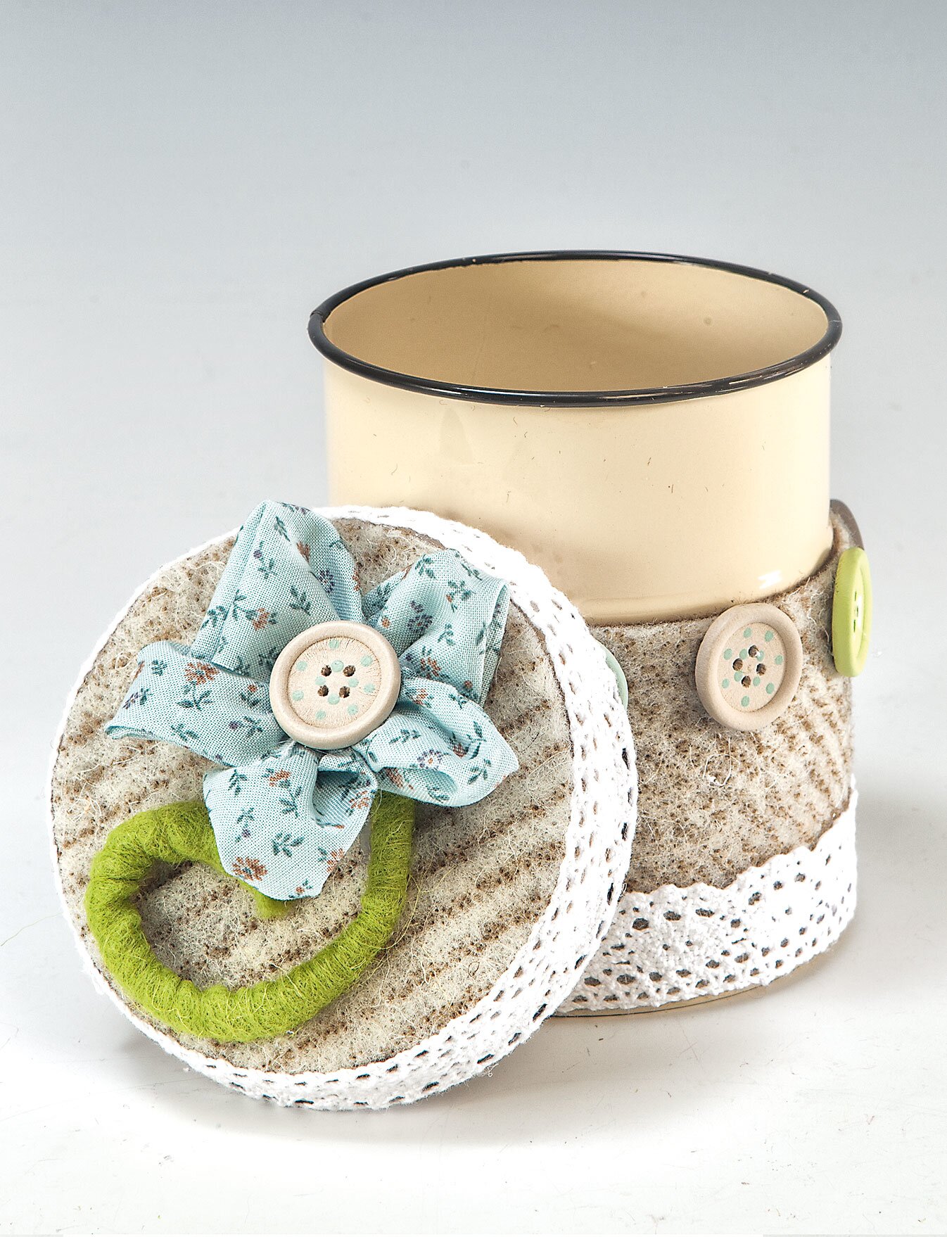 Na víčka nebo kolem plechovek nalepte další knoflíky nebo jiné vhodné doplňky.