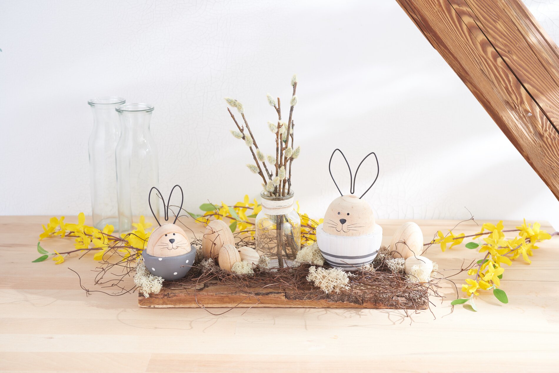 Vaší umělecké svobodě se meze nekladou! Ozdobte dubové prkénko dekorativní vrbou, třpytivým islandským mechem a kouzelnými dřevěnými vajíčky. V případě potřeby dekorace připevněte trochou horkého lepidla, aby stabilně držely.