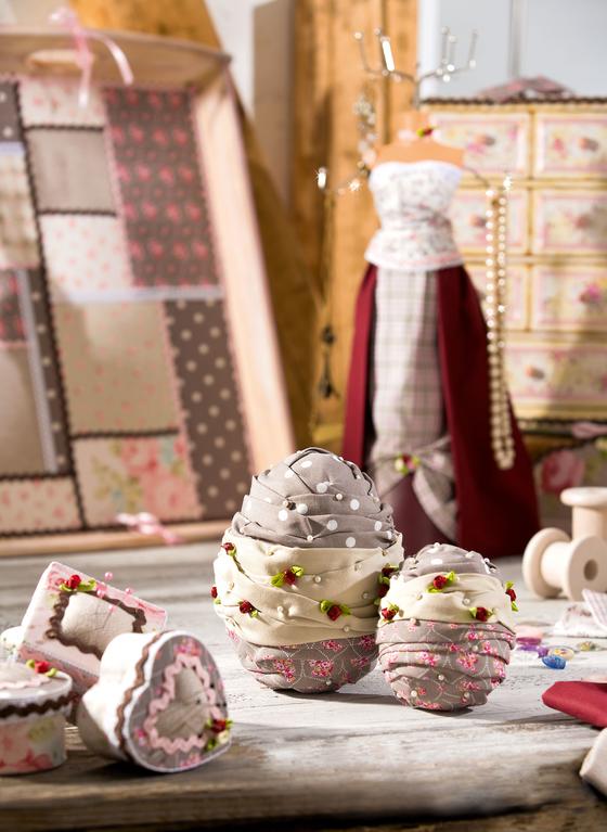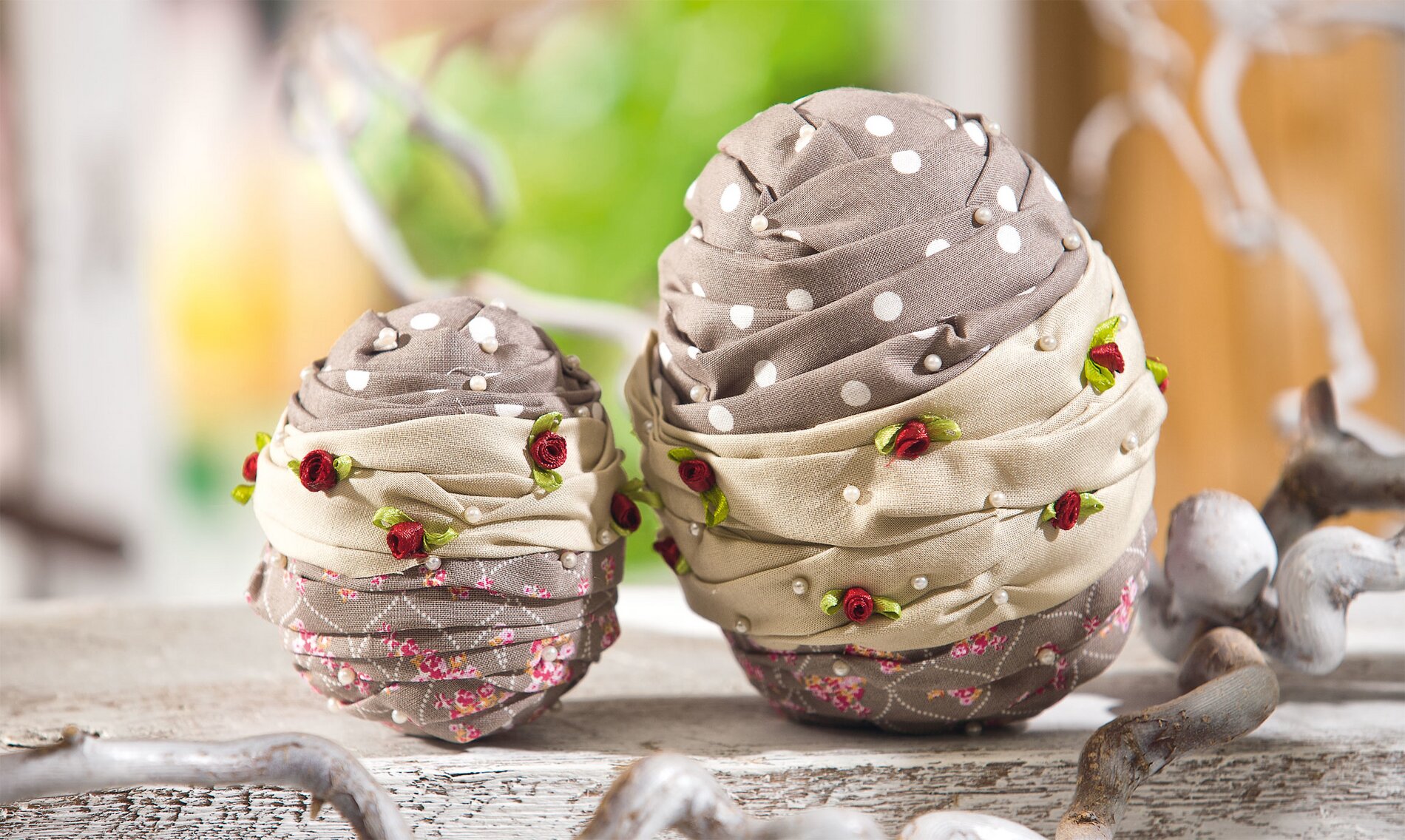 Široký pruh vzorované látky přišpendlete k jedné špičce vajíčka, okraje přehněte dovnitř a pruh nepravidelně obtočte kolem vajíčka a zajistěte ozdobnými špendlíky.