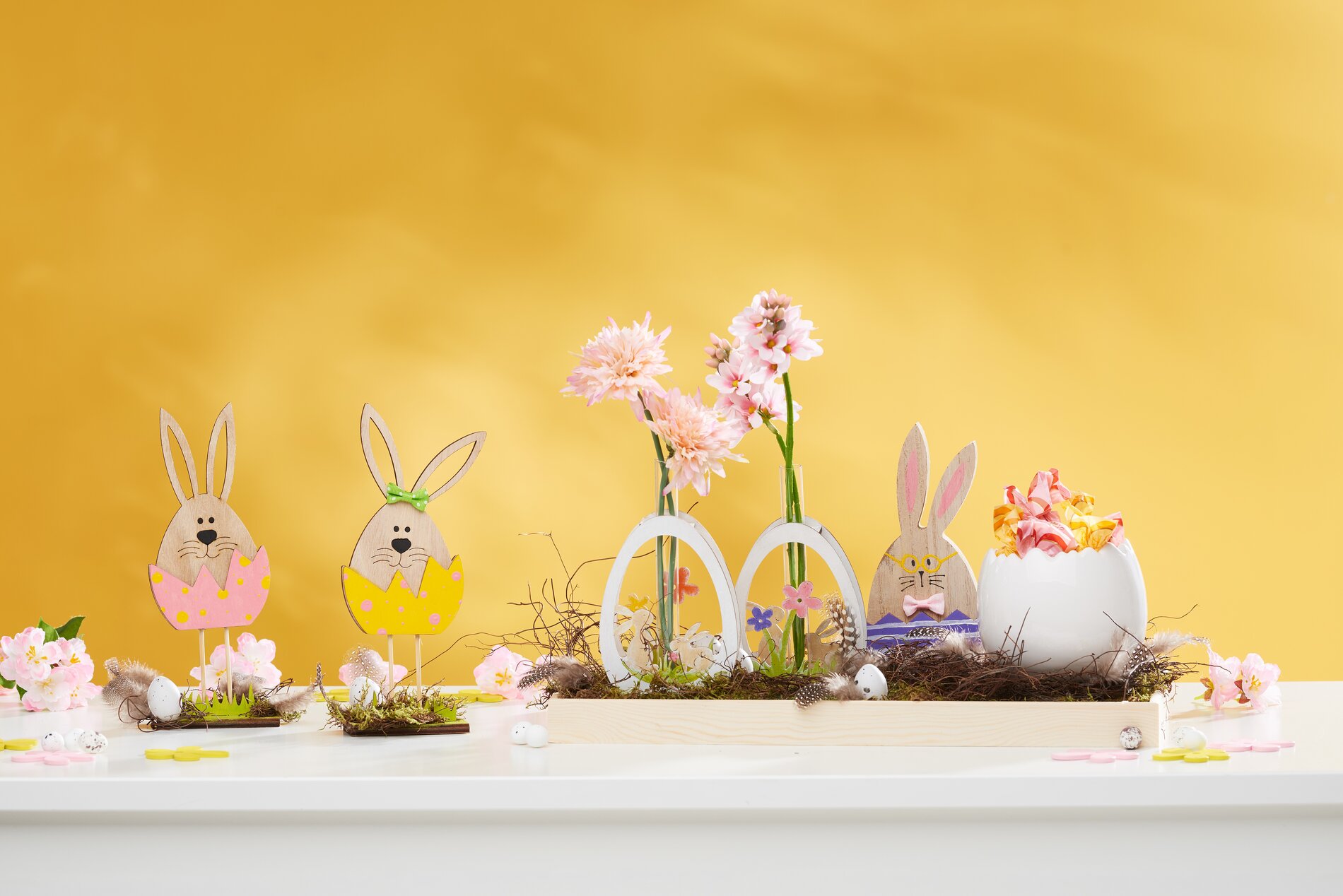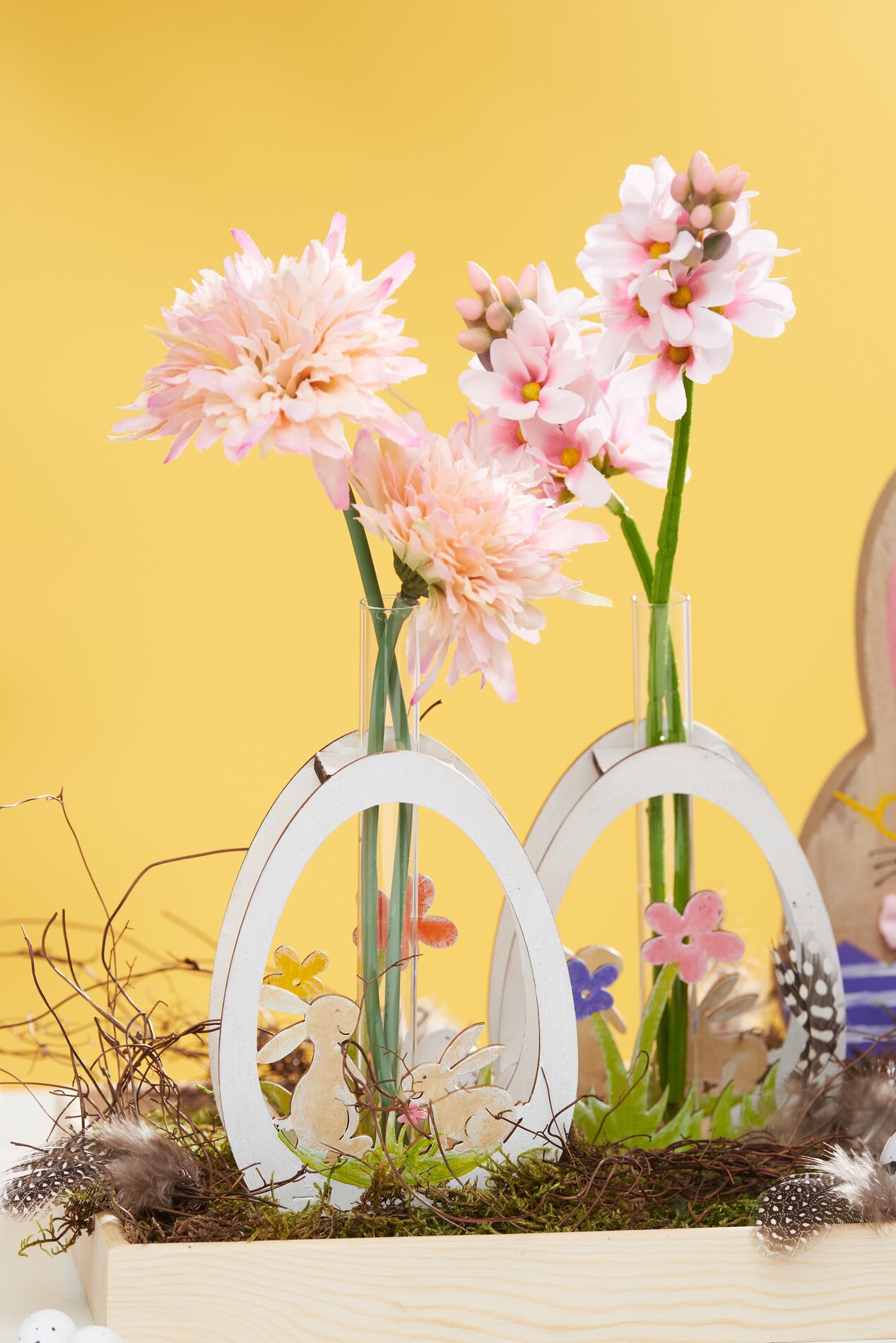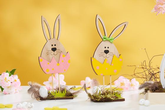 Nejprve vybarvěte držák na zkumavky VBS "Vajíčko se zajíčkem", stejně jako zajíčka VBS Bonnie, "Stromového zajíčka" a "Schlappiho zajíčka" různými barvami pro velikonoční řemesla. Vaší kreativitě se meze nekladou. Pomocí bambusových špejlí můžete kreslit jemné čáry a tečky. Poté přilepte na zajíčky mini mašličky podle potřeby pomocí řemeslného lepidla VBS. Jakmile vše dostatečně zaschne, slepte jednotlivé figurky k sobě.