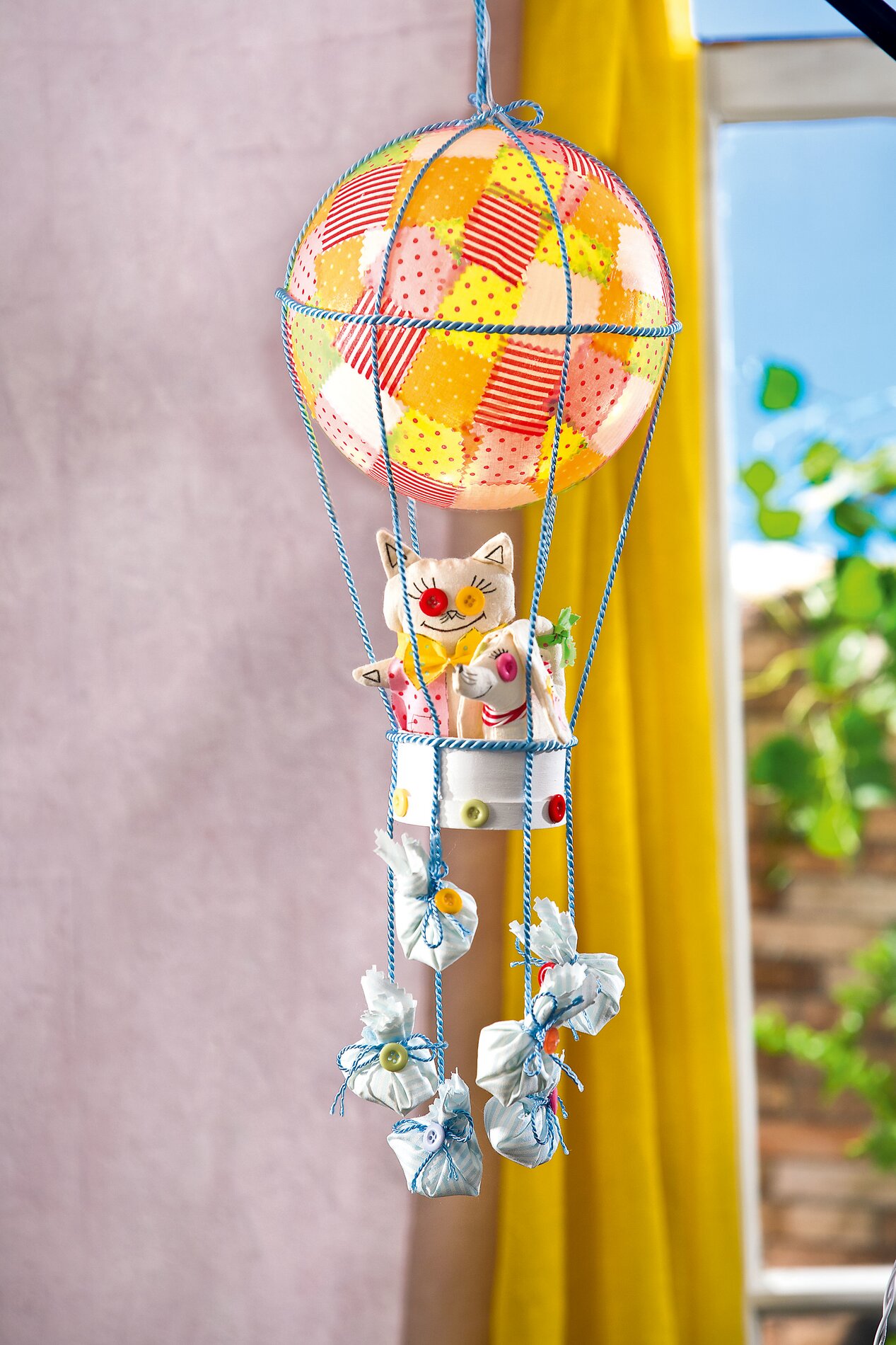 Nyní provlékněte pohádková světýlka otvorem v akrylové kouli. Balónkový košík můžete naplnit malými plyšovými hračkami.