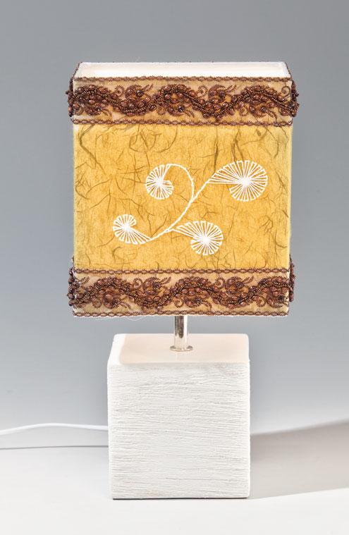 Poutavý design této stylové lampy vypadá obzvlášť působivě. Dekorativní okraje poseté perlami zde byly zvoleny jako rám pro ozdobnou grafiku napnutou nití. Barevné pozadí tvoří slaměné hedvábí.