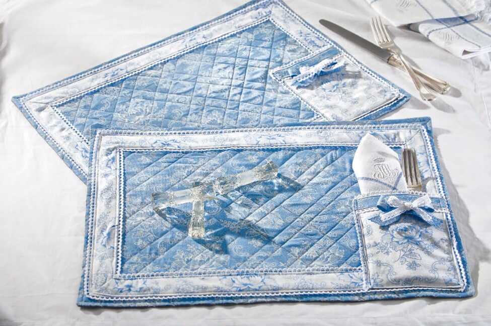 Pro kapsu na příbory položte bílý a šedý polotovar pravou stranou k sobě, sešijte je k sobě s výjimkou malého otvoru a otočte je naruby. Z modré látky ušijte úzké proužky, které pak přišijte k hornímu okraji tašky spolu s krajkou. Hotový sáček na příbory s krajkou přišijte k prostírání.