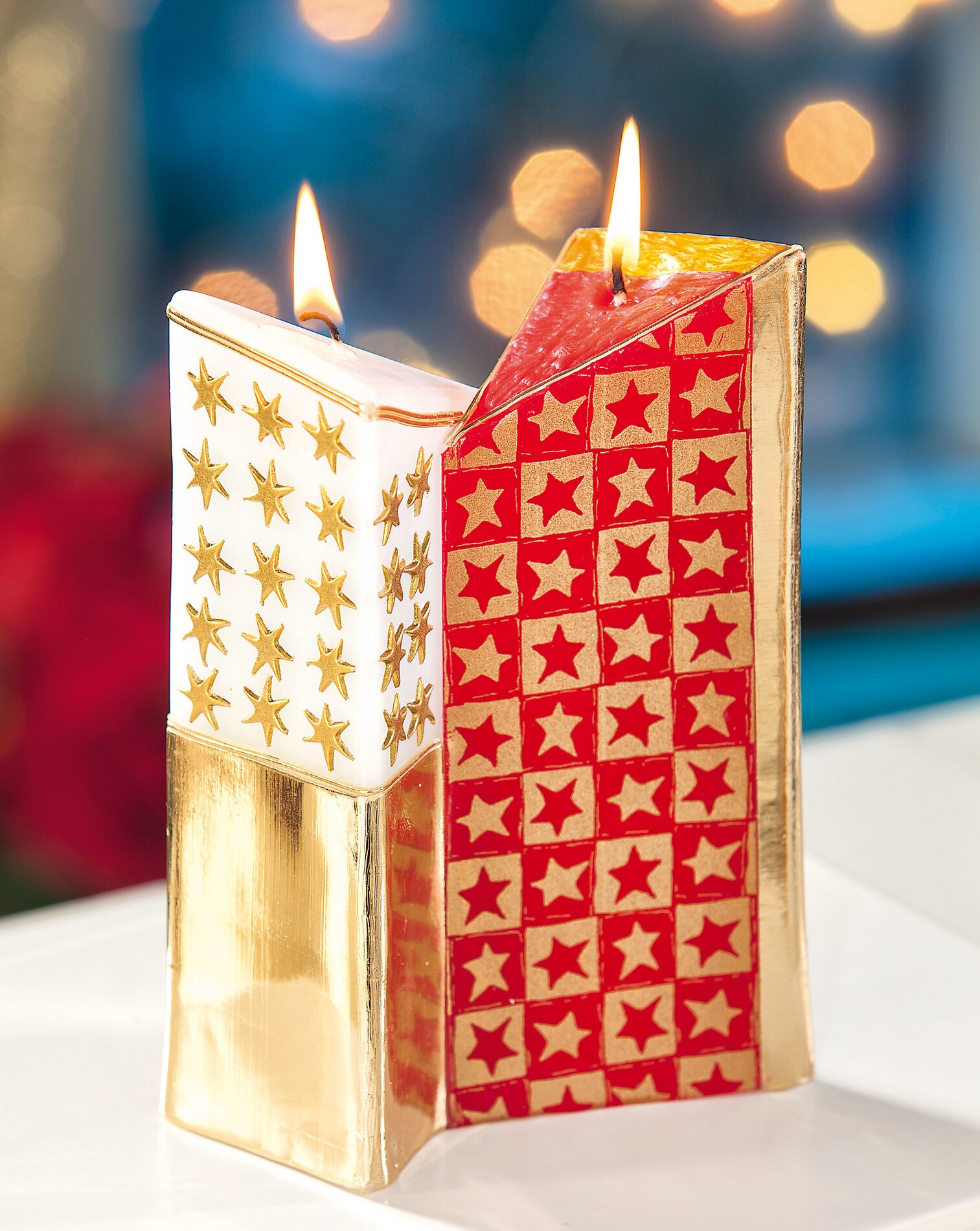Personalizovaný design svíček je jednoduchý a výsledkem jsou jedinečné svíčky. V tomto návodu jsou ozdobné voskové panely v lesklé zlaté a vánoční červené barvě, které dodávají neobvyklému tvaru této designové svíčky vysoce kvalitní vzhled. Jednotlivé hvězdičky na bílých plochách spolu dokonale ladí.