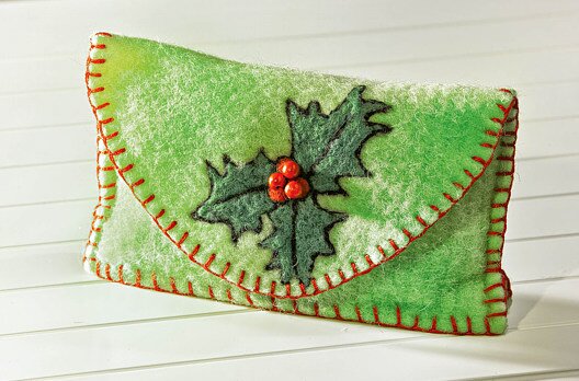 Z plstěné stuhy ustřihněte tři kusy dlouhé 20 cm a sešijte je k sobě tak, aby vznikl díl o rozměrech přibližně 40 x 20 cm. Poté rozložte přídavky na švy a prošijte je na místě na levé a pravé straně. Nyní přeložte plstěný proužek podle obrázku a zajistěte jej špendlíky nebo podvazkovou nití. Důležité je, aby jeden šev byl na přechodu mezi kapsou a klopou, druhý pod spodní částí, kde je asi 6 cm široká stojatá plocha přeložena dovnitř. Tu nejprve zajistěte sešitím přes otevřené strany dna a poté sešijte boky tašky k sobě. Poté zakulatíme klopu. Nyní přeneste šablonu s motivem cesmíny na klopu pomocí fixy. Dovnitř motivu vložte jemné vrstvy vílí vlny a plstěte je na speciální podložce tak dlouho, dokud není motiv zplstěn na velké ploše. Nakonec obrysy uplstěte jemnými vlákny černé vílí vlny a jednou jehlou a hotový motiv ozdobte dřevěnými korálky. Celou tašku obšijte klouzavým stehem, abyste zakryli švy, a nakonec připevněte magnetické zapínání. Aby nebylo zvenčí vidět, použijte malý kousek plsti, který všijete pod klopu.