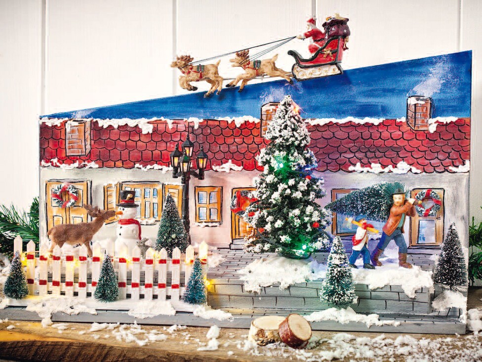 After it Acrylic paint dries up, plan the arrangement of your miniature decorations. Paint and fill in decorative snow. Finally, glue all miniatures on and to the painting.