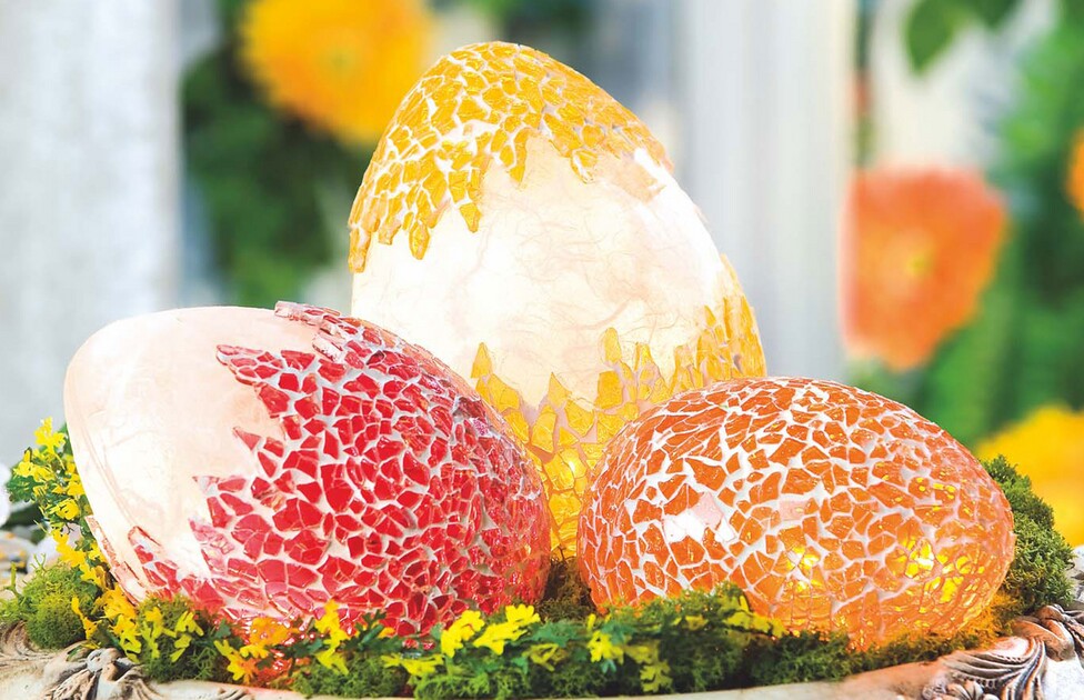 This time we have big eggs Acrylic-with Crackle-Mosaic stones and pasted Straw silk paper . With the inserted chain of lights this Easter decoration idea becomes really atmospheric and guaranteed individual.