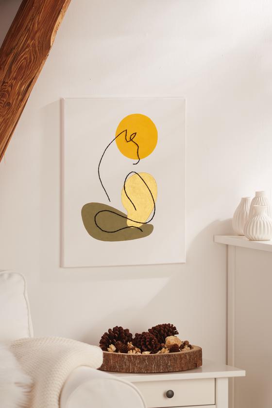 This classy mural is a great example of how abstract acrylic painting can be combined with some embroidery. Let our abstract depiction of a cat and a kneeling human inspire you to create your own artwork.