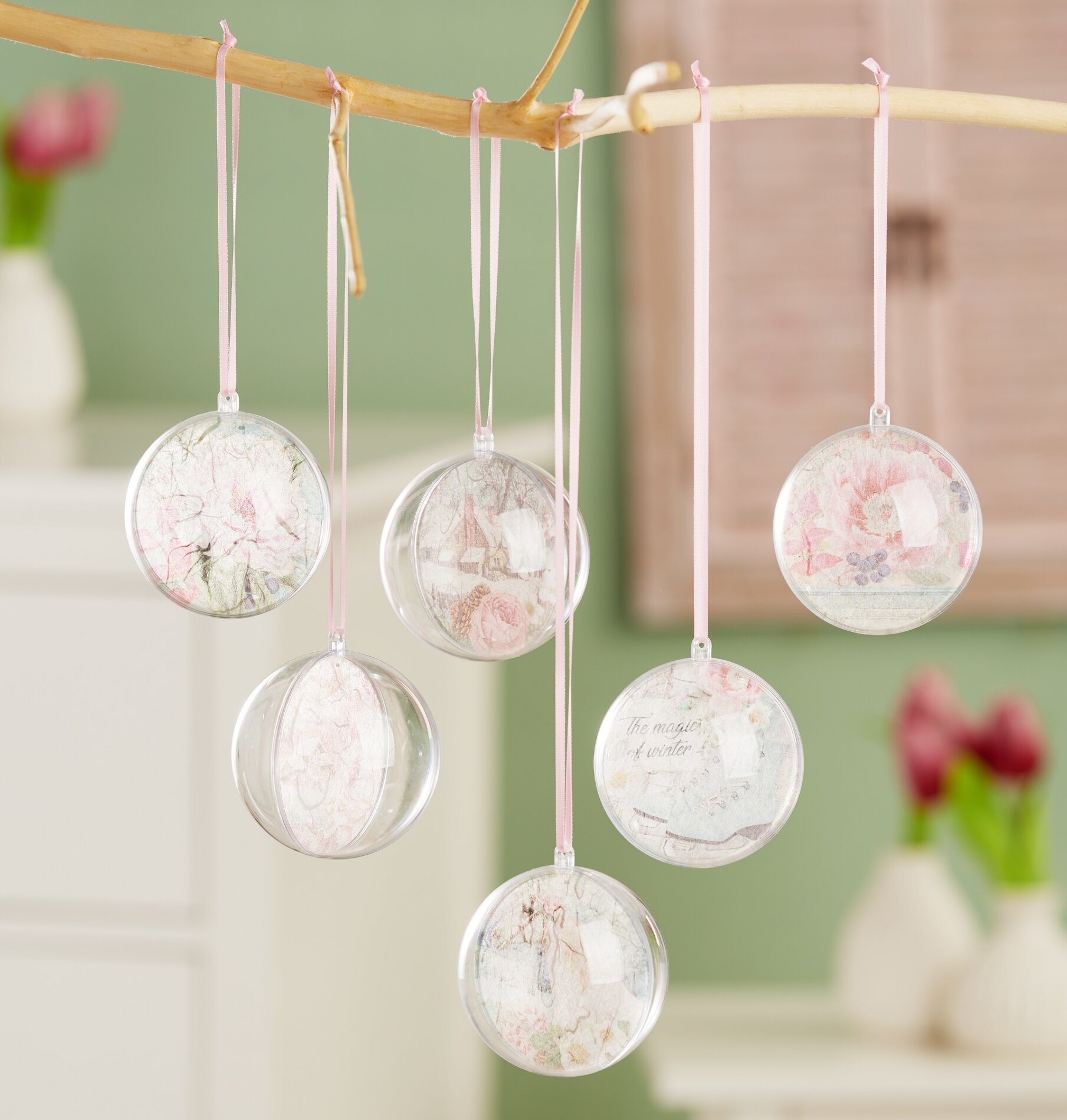 When dry, position the separating disc between two acrylic sphere halves and close. Attach a ribbon to the hanging loop for hanging.