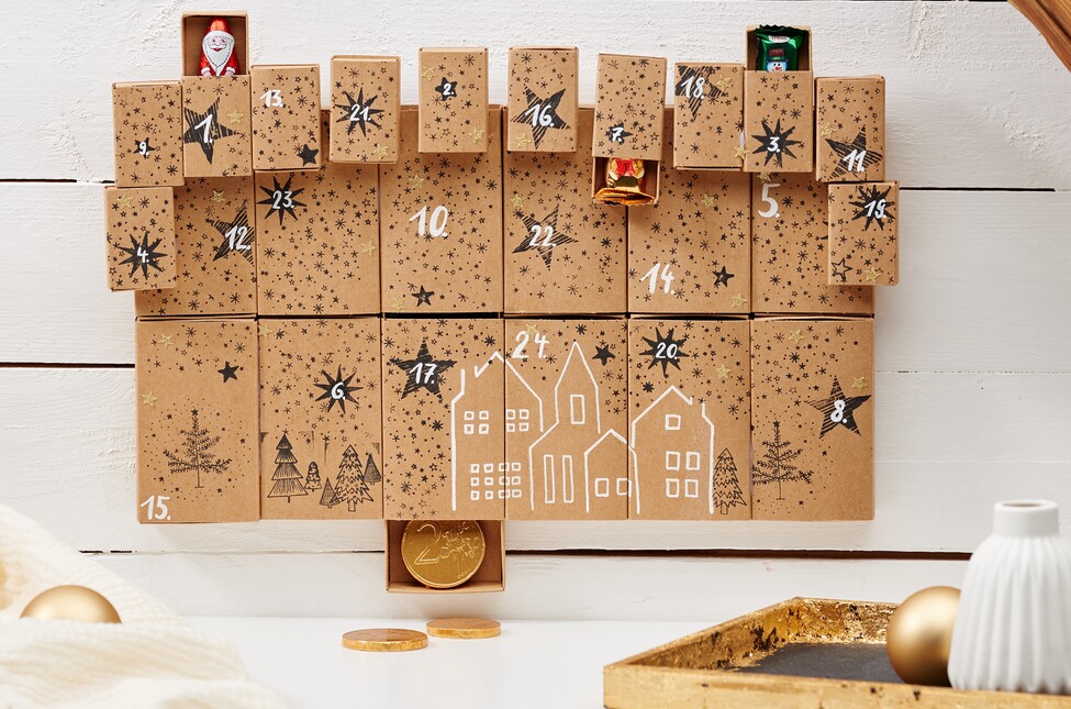 Glue six large matchboxes upright next to each other on the corrugated cardboard cut. Do not glue the boxes together, otherwise you will not be able to open them later. Glue six more boxes on top to create a rectangle. You can now cut off the remaining corrugated cardboard blank.