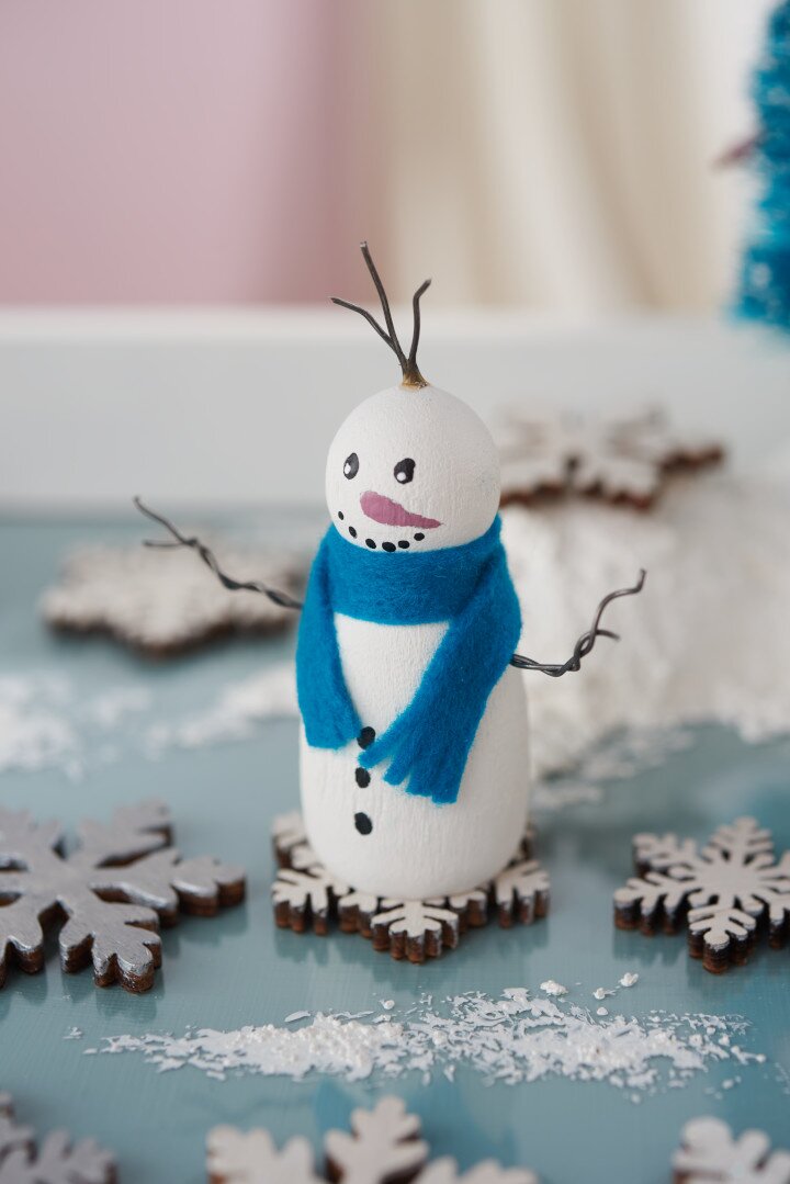 For the snowman, paint the figure cone white. Drill small holes in the figure for the arms and hair. Shape them out of wire and attach them in the holes with craft glue. Paint the face and heads on the snowman and decorate it with a scarf made from a strip of felt.