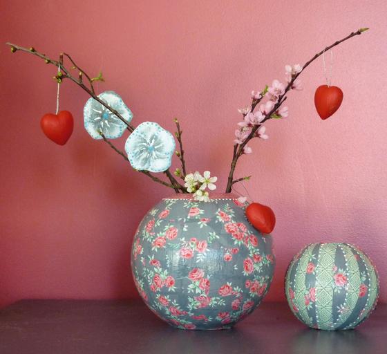 Depending on your taste, simply stick a few twigs into the vase and hang painted paper flowers and/or papier-mâché hearts in the twigs.